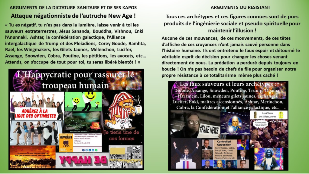 Ah ça va se faire tout seul, ok – Les aliens ou Trump et Poutine vont nous sauver – Il faut résister intelligemment, en cachette c’est mieux, faut faire semblant d’obéir (comprenez : j’ai un business à gérer en ville, sur internet et sur les réseaux, je ne peux quand même pas trop trop critiquer le système) + toute la cohorte des excuses pourries qui font que la testostérone a été remplacée par des tests pcr planétaires. Le nouille age permet d’accepter toutes les dérives totalitaires en laissant tout nous faire en boucle sans réagir !